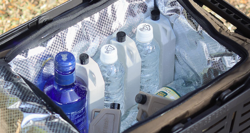 「COOLER BAG for HD BASKET」に350mlの缶ビール6本と「THE ICE ERA」をセットし、平均外気温24.2℃の室外に放置した際に -5℃の状態を約5時間キープすることが出来ました。使用するクーラーボックスの性能次第で、より長い保冷力を期待できます。