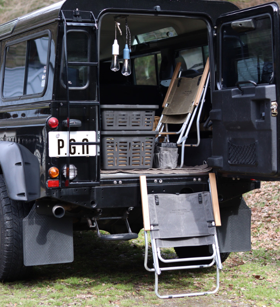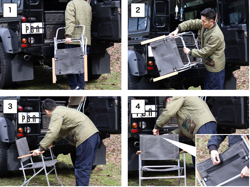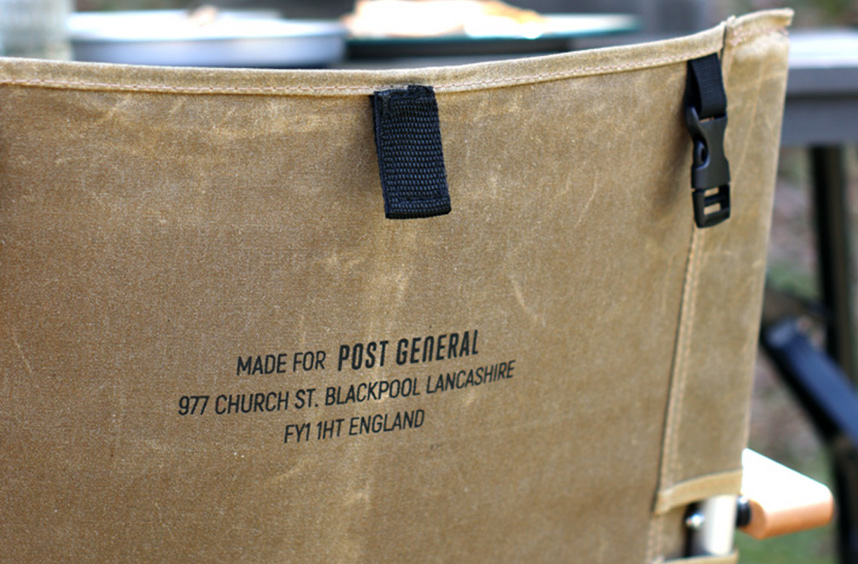 背面には本家 LAND ROVER CHAIR によく見られた所属隊のロゴではなくPOST GENERALのブランドロゴをさりげなく施しました。また、専用のチェアカバーブランケットを取り付けできるバックルを施し利便性を追及しました。
