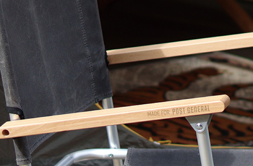 木製の肘置きの側面にPOST GENERALのロゴの刻印を入れました。